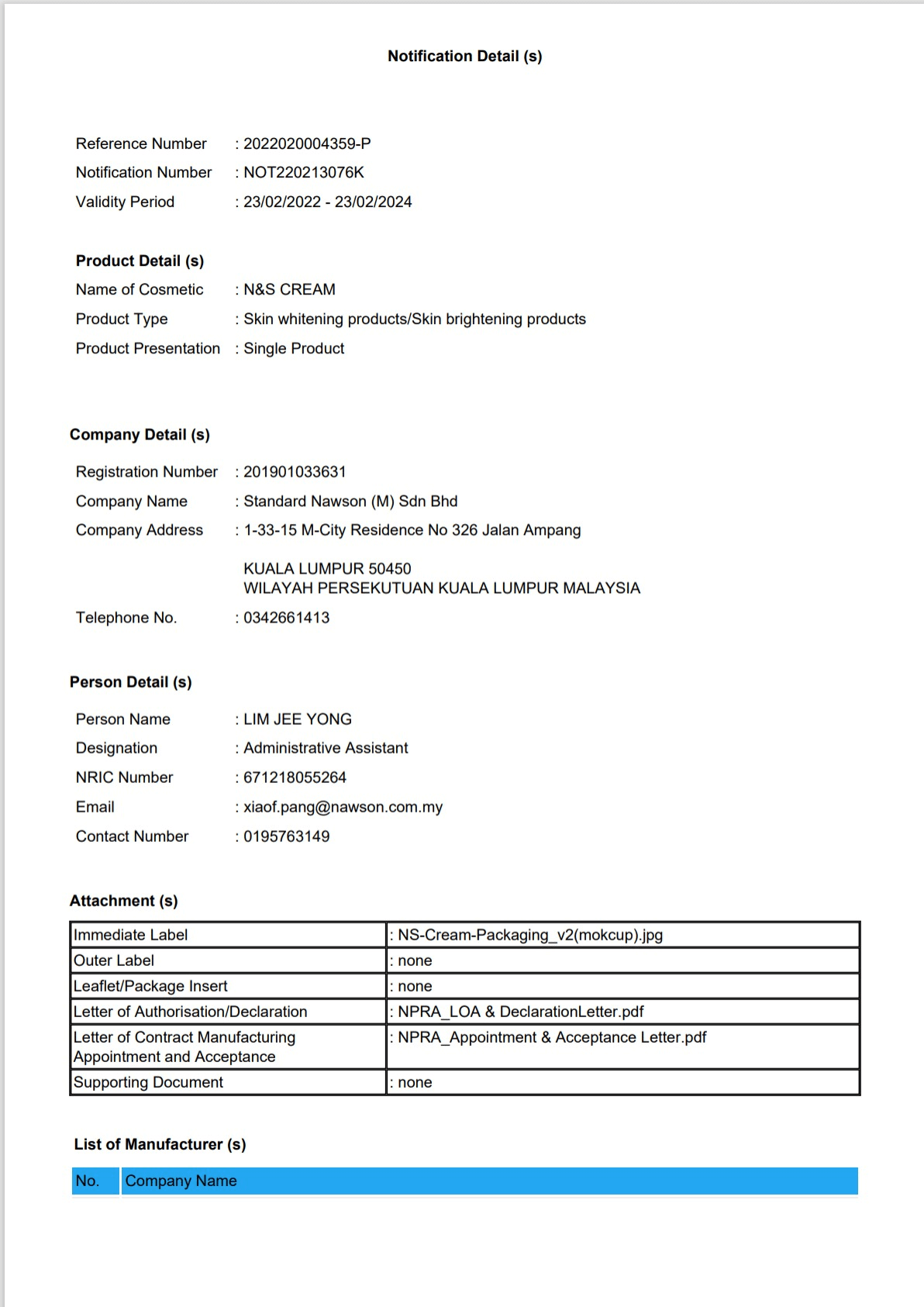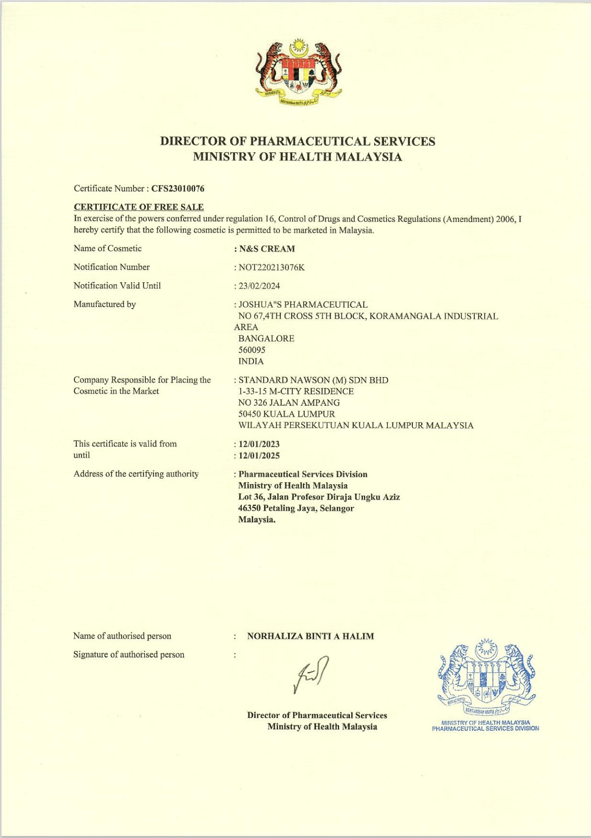 NS Cream is registered and approved by the Ministry of Health Malaysia through its online registration system.