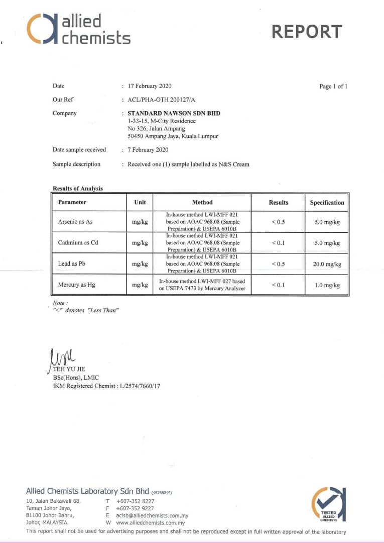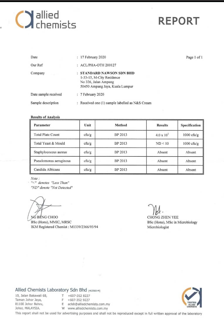Simultaneously, we also send NS Cream to a government-approved laboratory for micro-organism and heavy metal testing. This process ensures that the product undergoes rigorous testing and obtains reassuring results that boost confidence in our customers: