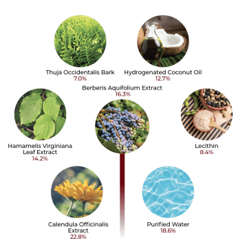 The six dots in the outer ring represent Calendula Officinalis Extract, Hamamelis Virginiana Leaf Extract, Thuja Occidentalis Bark, Hydrogenated Coconut Oil, Lecithin, and purified water. The central dot signifies Berberis Aquifolium Extracts because it has a circular shape appearance.