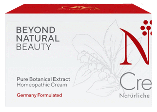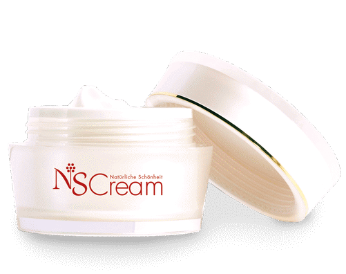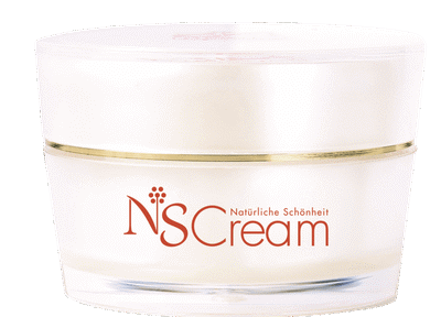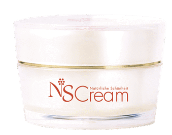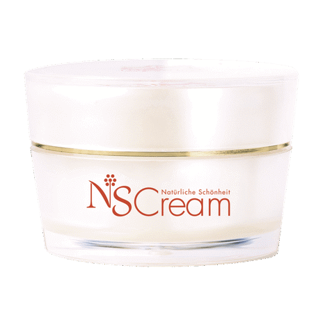 The letter "N" in the NS Cream logo features 7 dots, with 6 dots arranged in an outer circle corresponding to the 6 dots in the German "Naturliche Schonheit" while the central dot represents one of the key ingredients used in its formulation: Berberis Aquifolium Extracts.