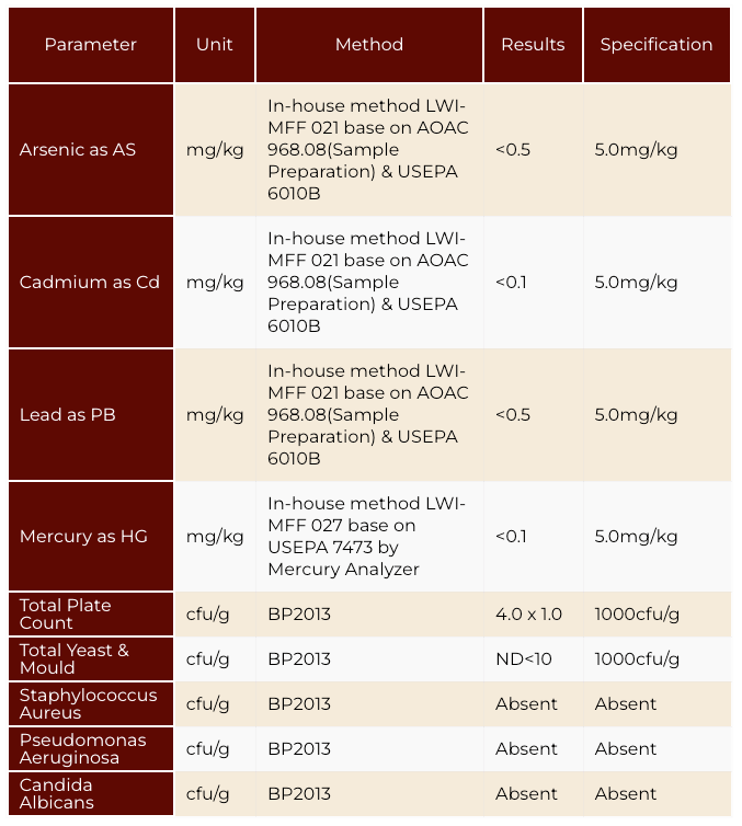 Cadmium as Cd | mg/kg | In-house method LWI-MFF 021 base on AOAC 968.08(Sample Preparation) & USEPA 6010B | <0.1 | 5.0mg/kg |